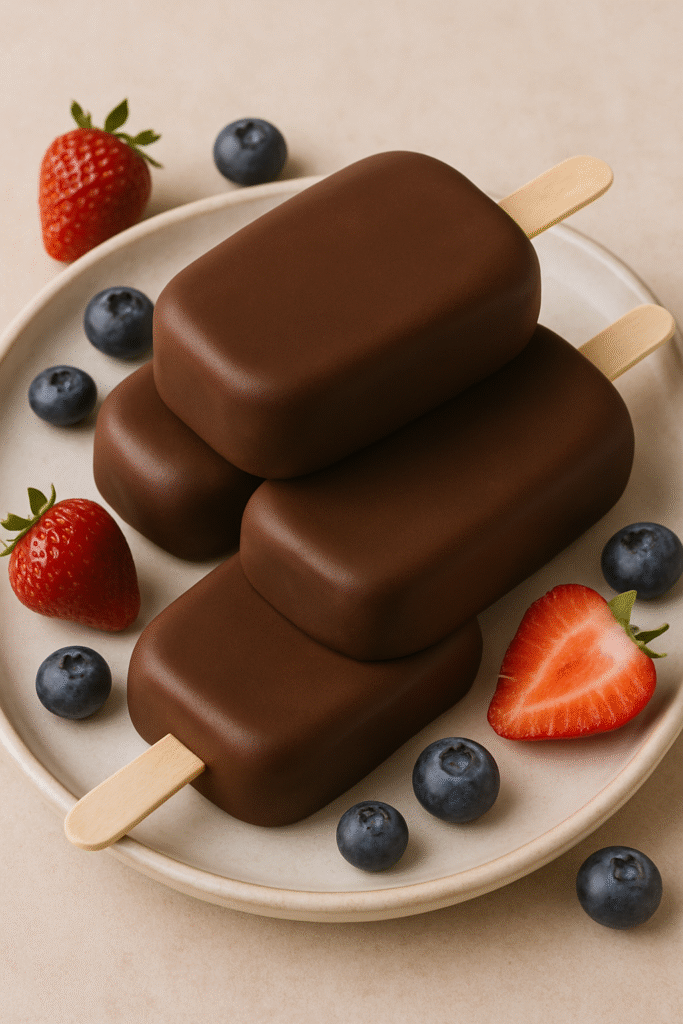 Creamy vanilla ice cream bars coated in rich chocolate—your freezer’s new favorite indulgence!