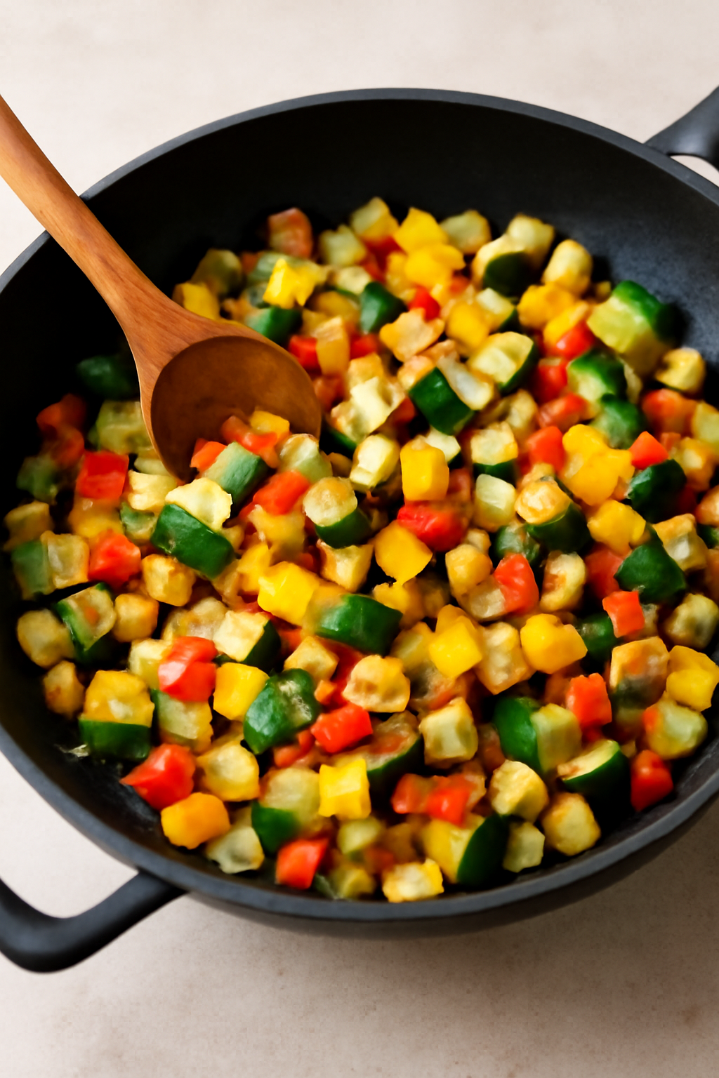 Heat the olive oil in a large pan over medium heat. Add the onion and garlic, and sauté for 2-3 minutes until softened. Add the bell peppers, zucchini, and eggplant. Cook for 8-10 minutes, until the vegetables are tender.