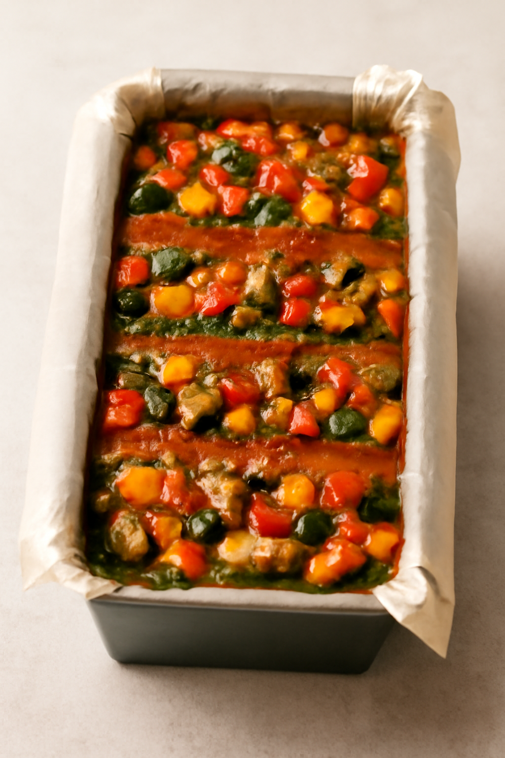 In a loaf pan lined with parchment paper, arrange the cooked vegetables in layers. Start with a layer of spinach, followed by the quinoa, and then alternate the cooked vegetables. Press down lightly after each layer to compact them.
